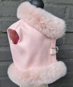 In prachtig vintage roze met vintage roze bont kraag en buikrand, satijnen binnenvoering in roze en zilverkleurig bevestigingshaakje voor het looplijntje. Sluit op de buik met stevig klittenband en smal fluwelen decoratie randje.